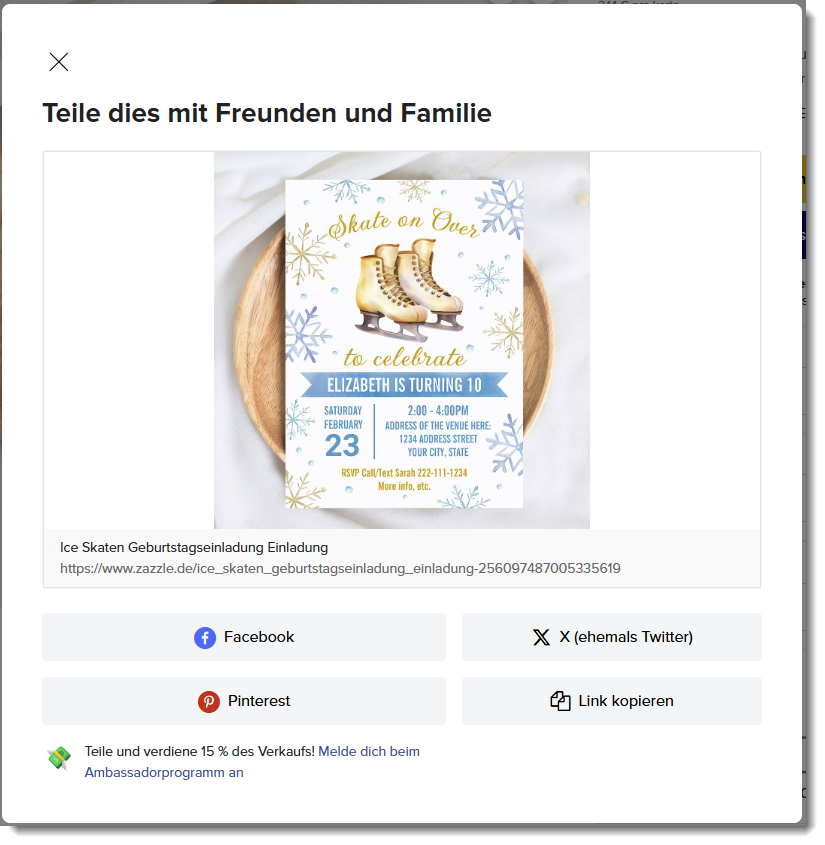 A: Sie können direkt von Ihrem Store oder Ihrer Kollektion aus über Zazzle's "Teilen"-Tool verlinken, um sicherzustellen, dass Sie den korrekten Eigenwerbungs-Link haben.