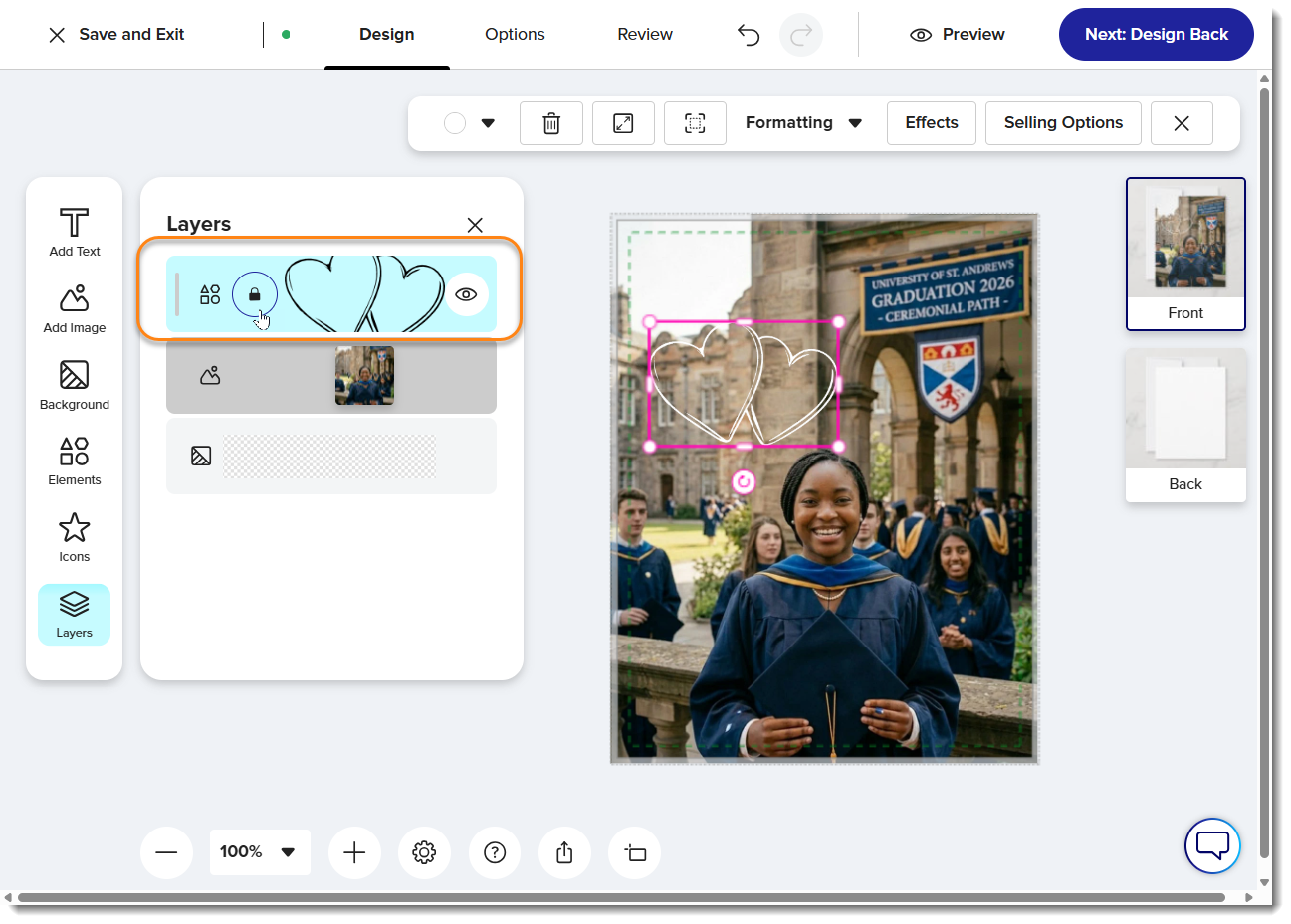 You can “lock” layers to ensure your design displays a certain way and provides customers with a smooth experience when customizing. This feature is helpful when you want specific layers to appear as intended but still give customers the flexibility to make further edits if needed. This is also a great step to avoid any accidental moves or edits on the customers end and should be utilized for a smoother customization experience.