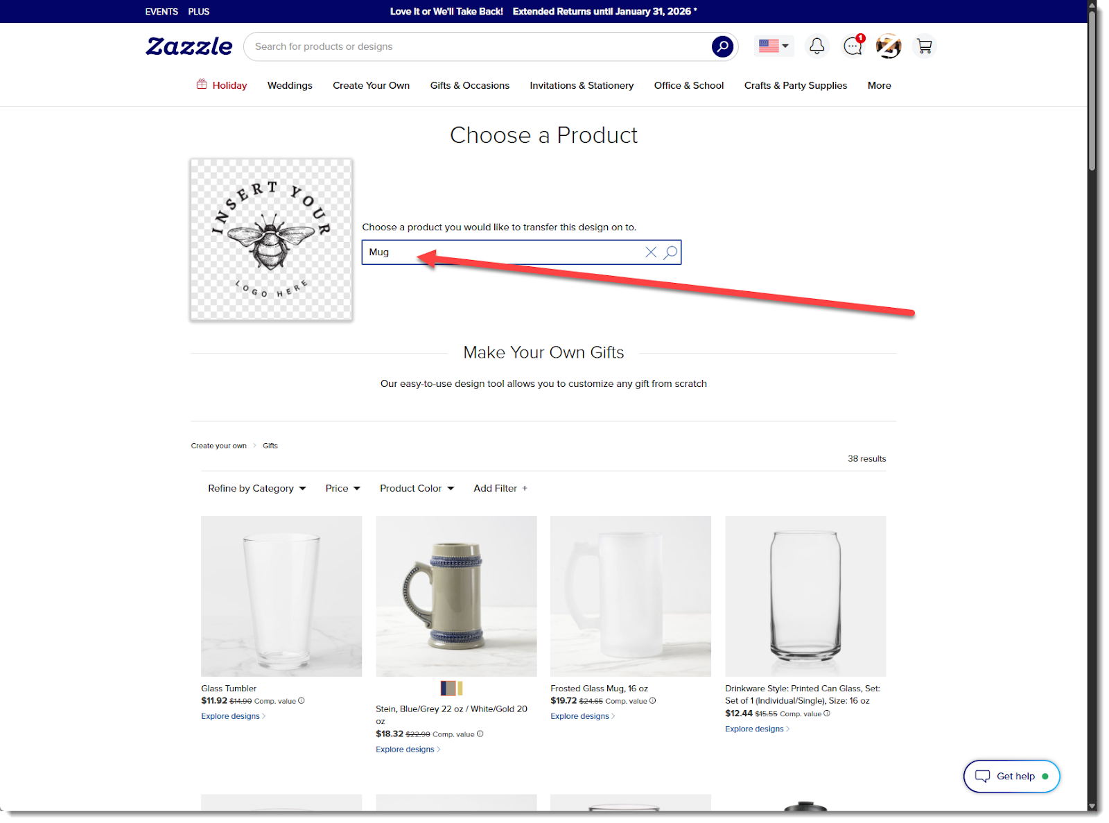 If the suggested blank products are not what you’re looking for, you can click on “View all Products” and type in the product you want to transfer this design onto. For example, “Mug”.