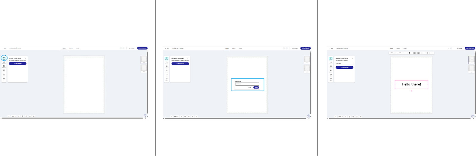 - Add new text – At the Design step, find the Left Toolbar and click the ‘Add Text’ button. A text input field will appear where you can type your desired text. Once you’ve entered your text, click ‘Submit’ to add it to your design.