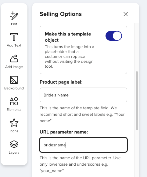 - Use short and sweet text labels on text templates. Customers look at template fields that you create and the labels that are inserted there aren’t always useful. For example: some Creators leave their template name set as “Text 1.” Other Creators are very verbose in their labels. We recommend using labels that are short and sweet that describe specifically what the text template is. Avoid putting instructional details in these labels. For example: if you’re creating a text template where a customer must insert the bride’s name, just use the text label “Bride’s Name”. You can find template settings under “selling options” within the design tool.