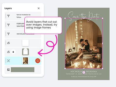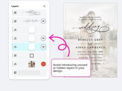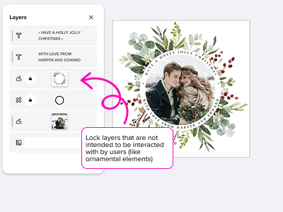 Minimize overlapping layers. It is highly recommended to minimize overlapping layers, as much as possible, so that consumers can easily (directly) select design objects on the canvas without having to hide layers or move objects around in order to customize template objects. To this end: try to keep image crops tight, text objects on their own row (or column), and avoid overlaps to a minimum.