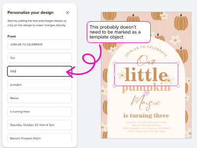 - Not everything should be marked as a template. Not everything on a design should be designated as a template object. For example, the word “and” probably shouldn’t be marked as a template object. Neither should decorative images like flowers or wreaths.