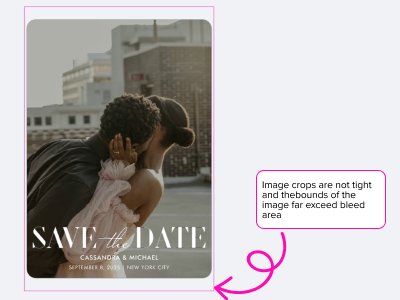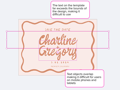 Keep text boxes and images within the design area Make sure any text boxes or image placeholders stay inside the intended design area. When boxes extend far beyond the boundaries, it can confuse customers - especially on smaller screens, by making it unclear where the box begins and ends. Oversized boxes or images can also cause long text to be cut off during printing. You may need to adjust text “line spacing” to adjust the height of the text bounding box so it does not overlap other bounding boxes, as some calligraphy fonts are unnecessarily tall.