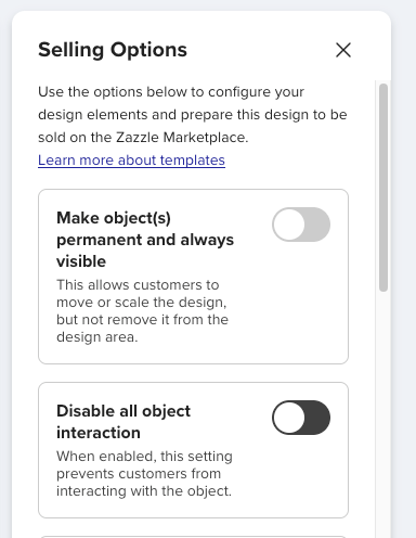 - Make object(s) permanent and always visible. Users can move, scale, and modify objects where this toggle is enabled, but they cannot delete the object from the design