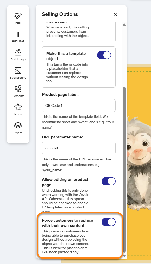 - Force customers to replace with their own content. Users must replace your image with their own before adding the item to cart. This property adds friction to the checkout process and could result in a lost sale. We recommend using your own judgement when setting this property and use it only when dealing with licensed content.
