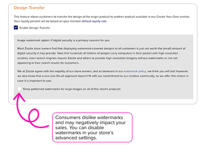 Be mindful of watermarks. The vast majority of stores on Zazzle do not have watermarks enabled. Anecdotally, we have observed watermarks on designs will negatively impact the consumer experience and ultimately conversion rate. Read more about watermarks