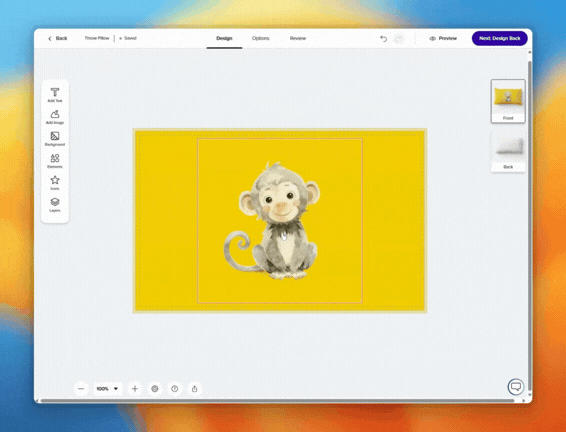 Leverage the background image feature for full-bleed imagery. Many times, we see that images that are intended to be printed for full-bleed are treated as a normal layer on the canvas. If the image isn’t expected to be interacted with by the customer, consider using the background image feature so that images are properly filled to the bleed and the image cropping is constrained to the bounds of the product’s designable area.