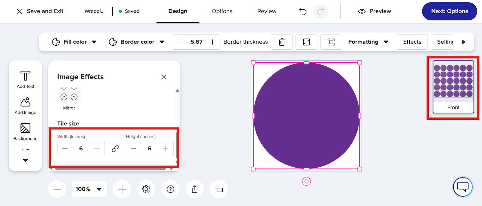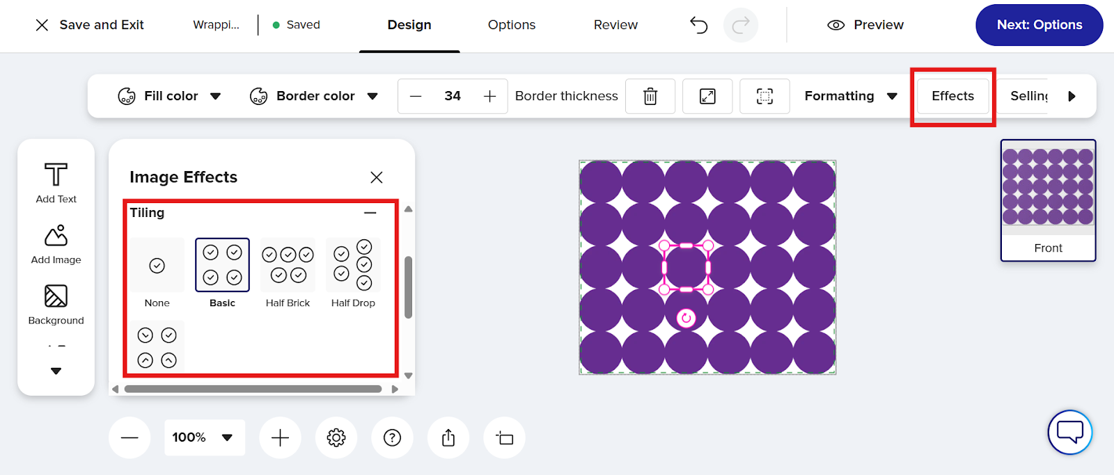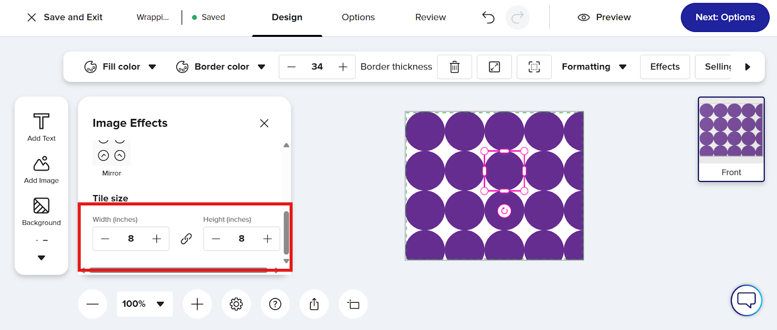 To view our Tiling settings, first select your design element by clicking it and going to Effects and scrolling down to Tiling. In the following examples, the design element is a single purple circle. We'll use it to create different repeating patterns of the circle. To get clean seams where one panel ends and the next one starts, use tile size widths that are whole number factors of 36 (for example: 2, 3, 4, 6, 9, 12, 18, or 36).