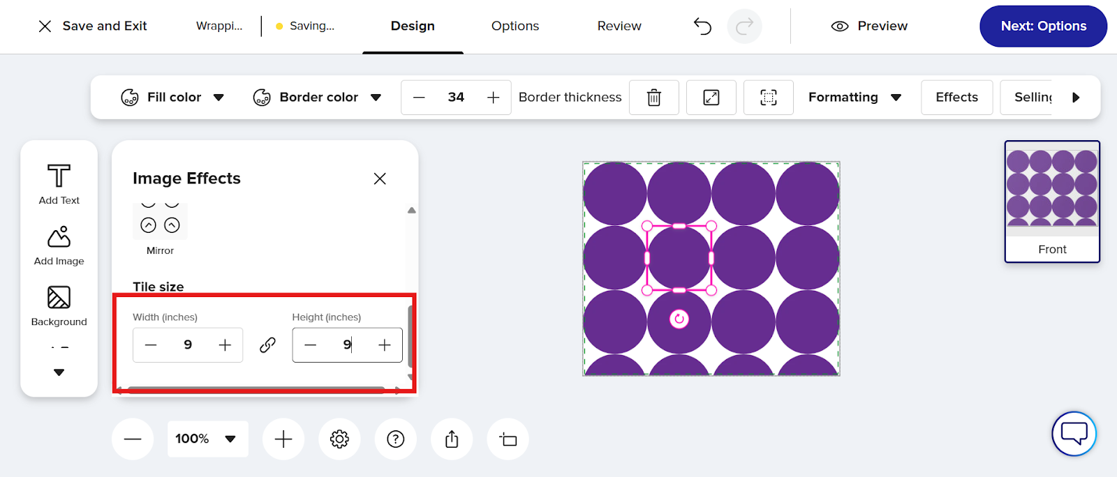When Design->Orientation Placement is set to “Tile”, it’s best to use tile size settings 6"x6", 3"x3", 2"x2", or 1"x1" for clean repetition of your design element throughout the entire pattern.