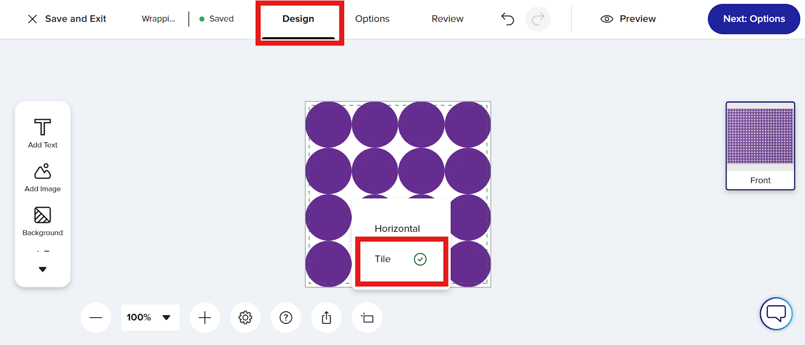The second method of tiling is to choose the “Tile” option in Design->Orientation. With this setting, it’s best to use tile size settings 6"x6", 3"x3", 2"x2", or 1"x1" for clean repetition of your design element throughout the entire pattern.