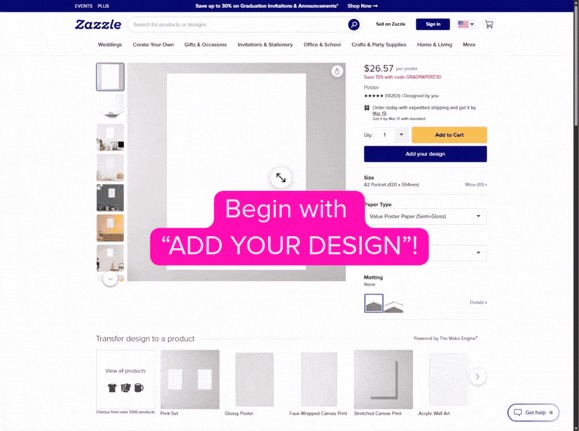 Una vez que hayas seleccionado el producto que deseas diseñar junto con cualquier opción de color, tipo de papel y tamaño, haz clic en "Añadir tu diseño" para comenzar a hacer tu creación.
