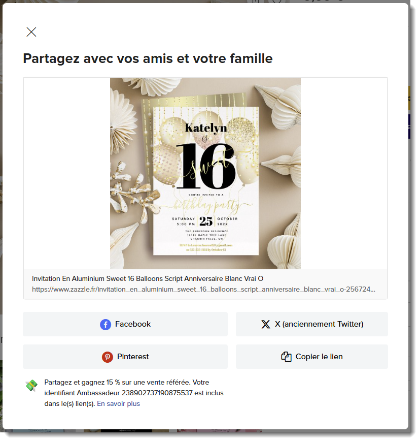 R : Un Lien de Promotion Croisée est une URL qui inclut votre ID d'Ambassadeur, que vous utilisez spécifiquement pour promouvoir des Produits créés sur Zazzle par quelqu'un d'autre que vous. Lorsqu'une personne achète via votre Lien de Promotion Croisée, vous gagnez une Commission de Référence égale à 15 % des Ventes de Référence Nettes sur cette vente.