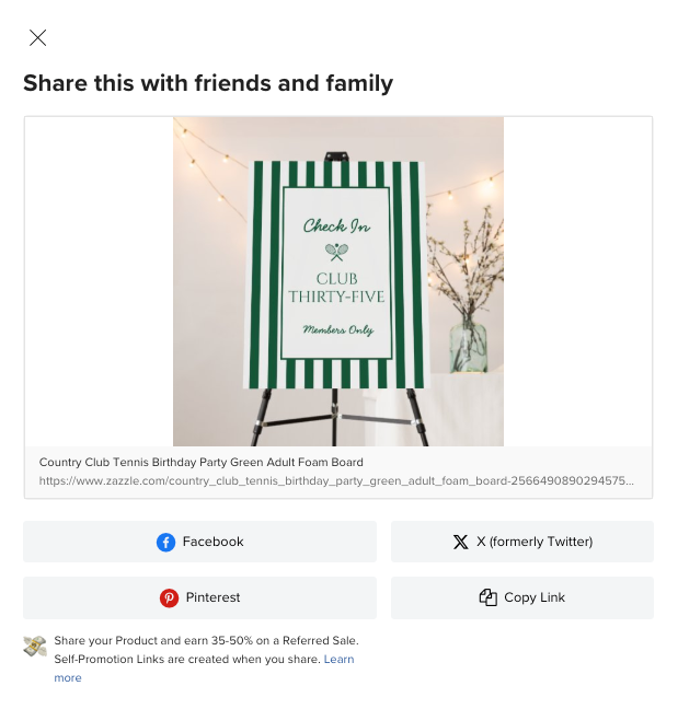 A: You can link directly from your Store or collection using Zazzle’s “share” tool to ensure you have the correct Self-Promotion Link.
